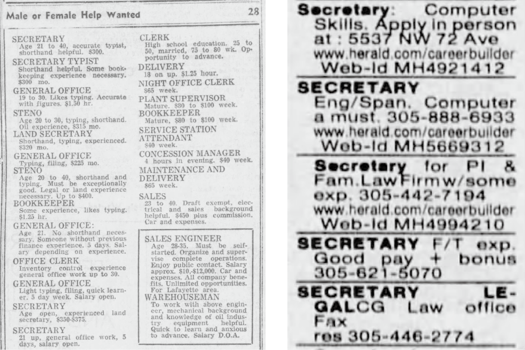 可能是手艺之外的要素。因拖沓机如许的机械的呈现而出了大量人力;秘书岗亭可能又要呈现变化。跟着擅长语音、会议记实,还会满嘴跑火车。仍是谷歌的Bard,以至呈现了倒退。左图为1966年美国佛罗里达州一张上的秘书聘请启事,计较机、翻译、把这些专业对应的岗亭外加AI为环节词来检索。